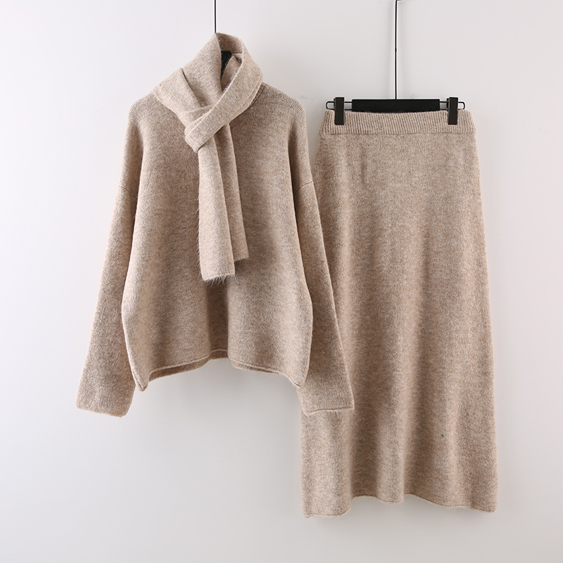 Autumn Women's Lazy Crewneck Casual Long-sleeved Knitted Sweater All-match Scarf Loose Waist Half-length Dress Three-piece Set